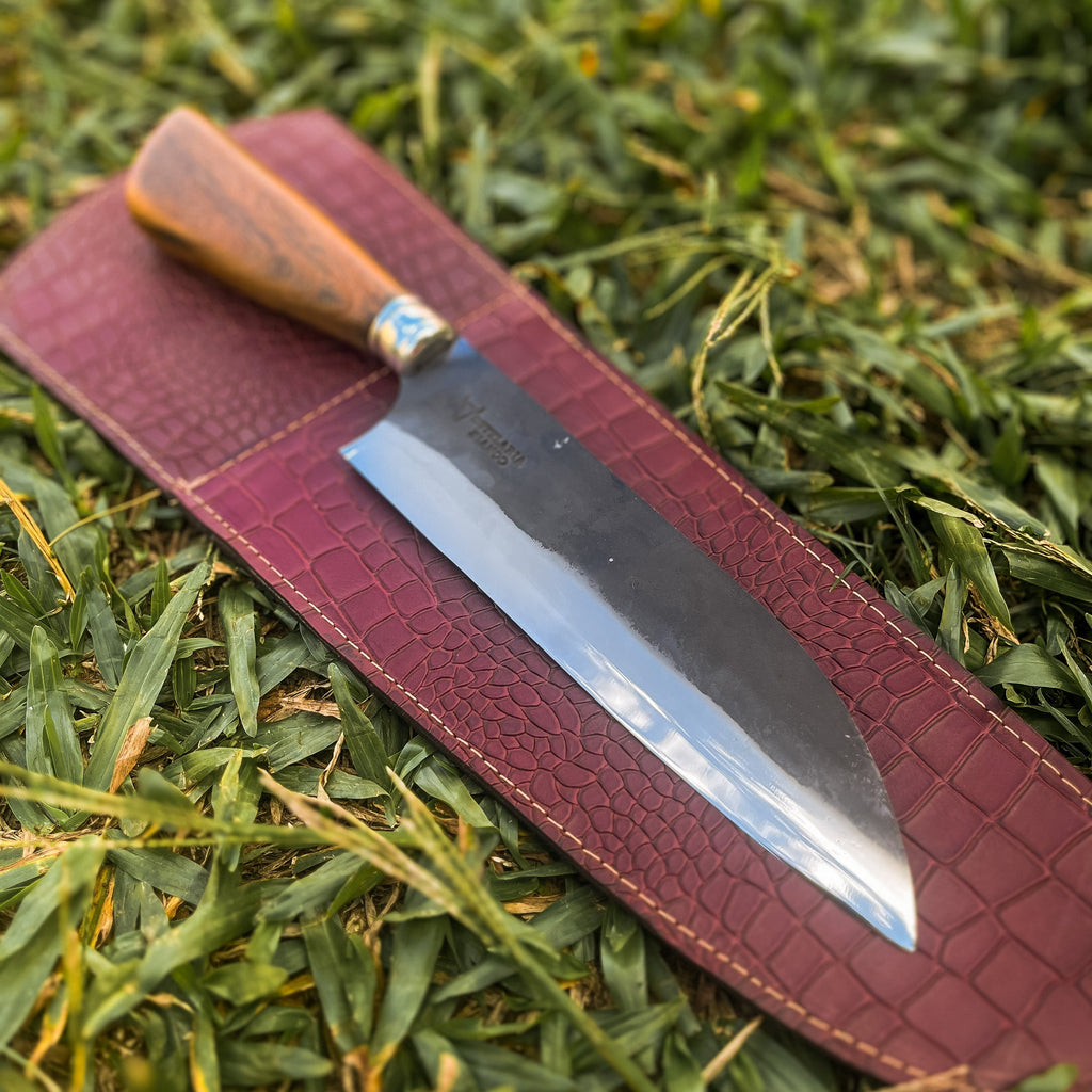 - Design e Ergonomia: A faca possui um cabo feito de madeira de lei rara, projetado para conforto e controle durante o uso.